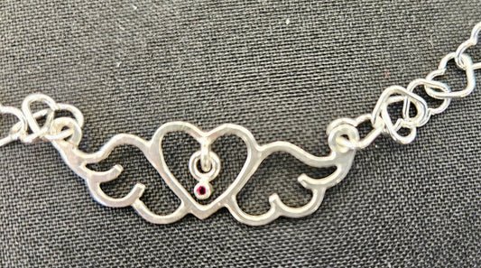 Small Heart-Wings Necklace with Ruby Charm and Sterling Silver Heart Chain