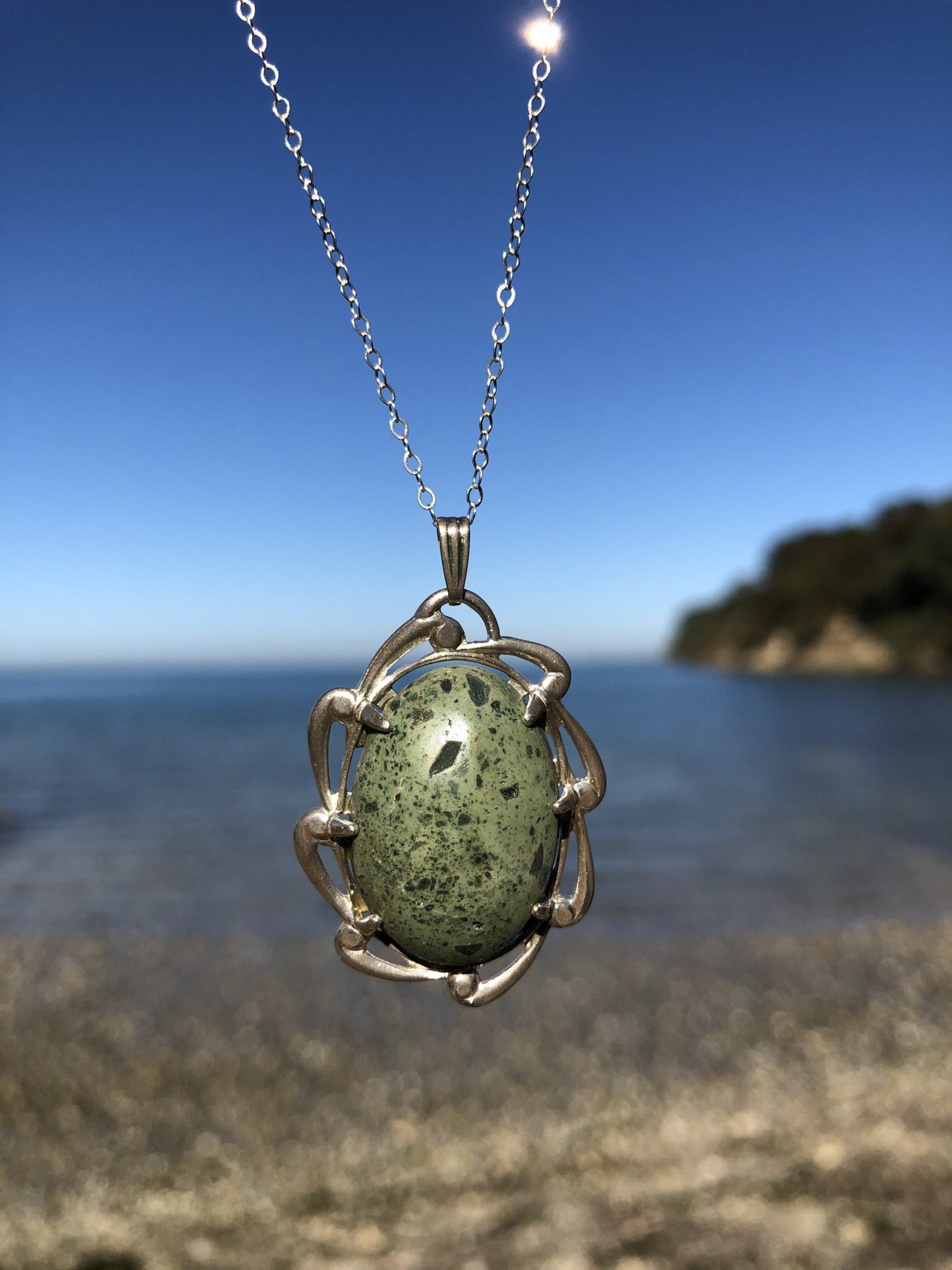 Necklace, green rhyolite from Coromandel NZ, hand polished into a 25x18mm cabochon and set in a sterling silver setting with an 18 inch sterling silver chain